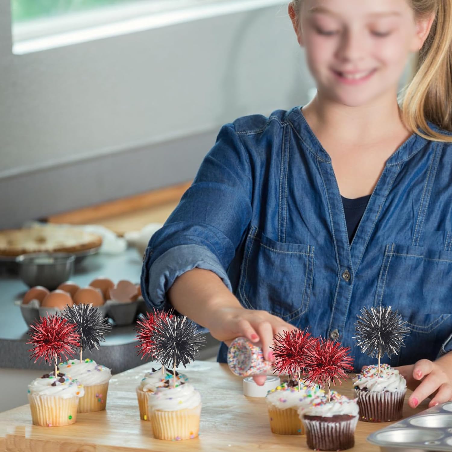 40 PCS Foil Firework Cupcake Toppers Sparkle Tinsel Cupcake Picks Fireworks Birthday Party Decorations Cocktail Fruit Toothpick for Birthday Wedding Graduation Party Decorations Supplies Black Red