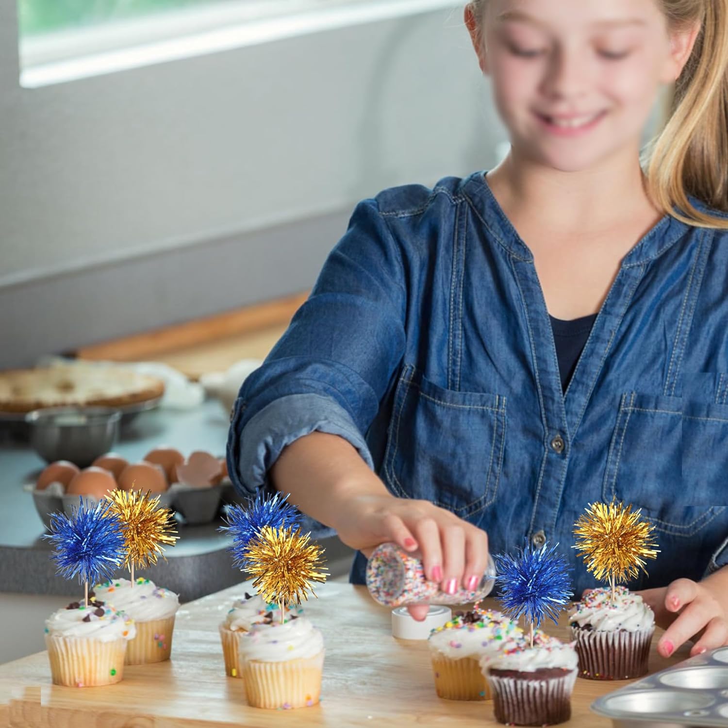 40 PCS Foil Firework Cupcake Toppers Sparkle Tinsel Cupcake Picks Fireworks Birthday Party Decorations Cocktail Fruit Toothpick for Birthday Wedding Graduation Party Decorations Supplies Gold Blue