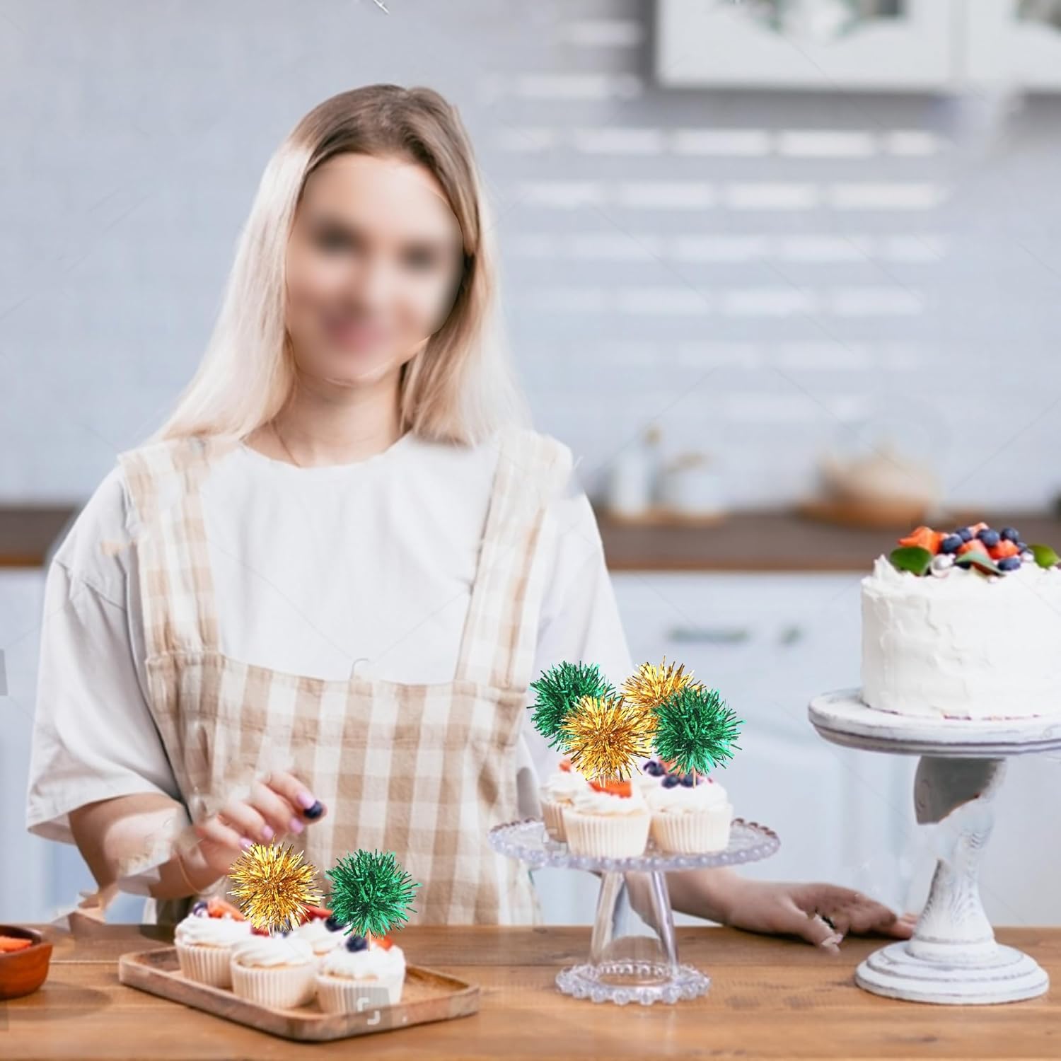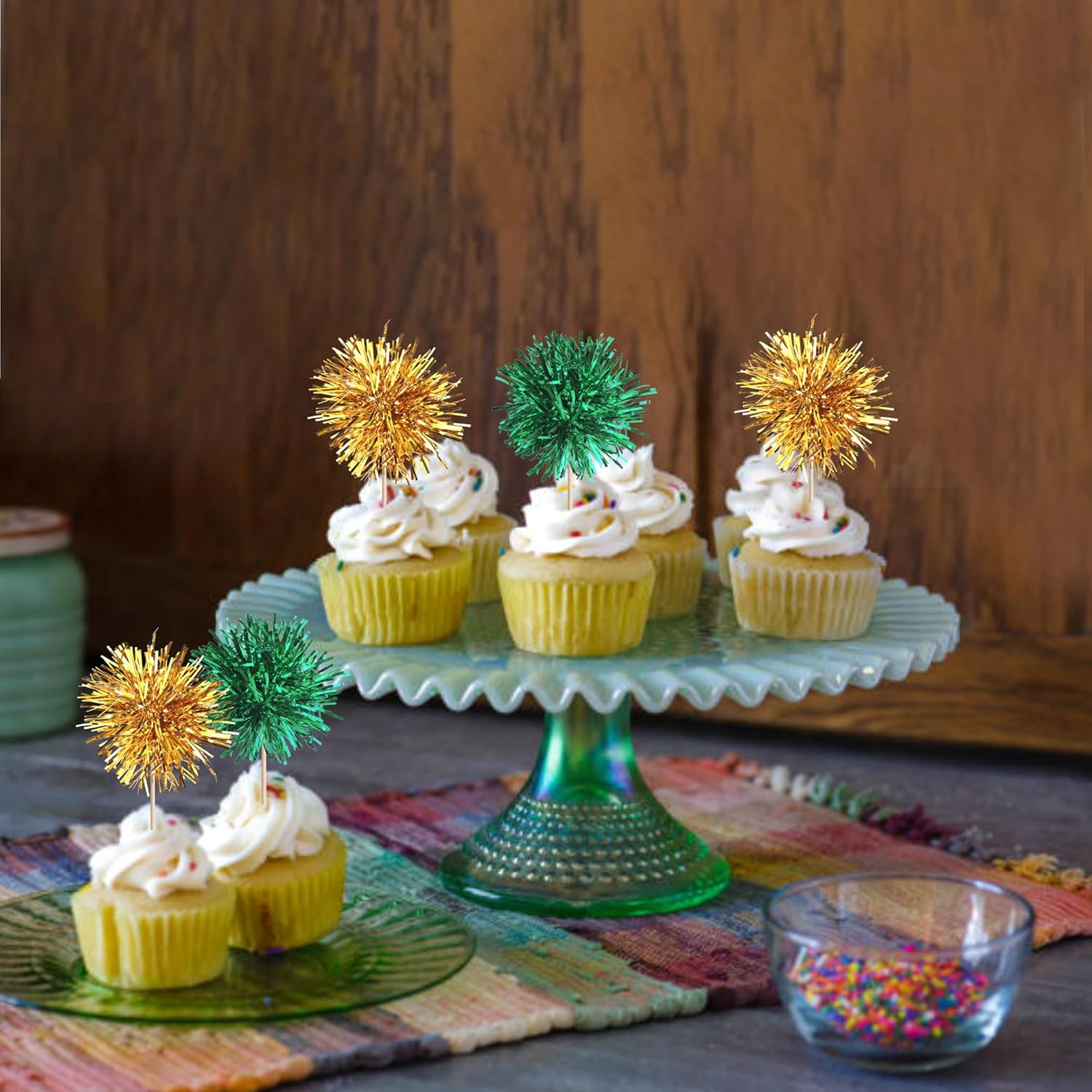 40 PCS Foil Firework Cupcake Toppers Fireworks Cupcake Picks Sparkle Tinsel Cake Decorations Cocktail Fruit Toothpick for Firework Theme Birthday Wedding Graduation Party Decor Supplies Gold Green