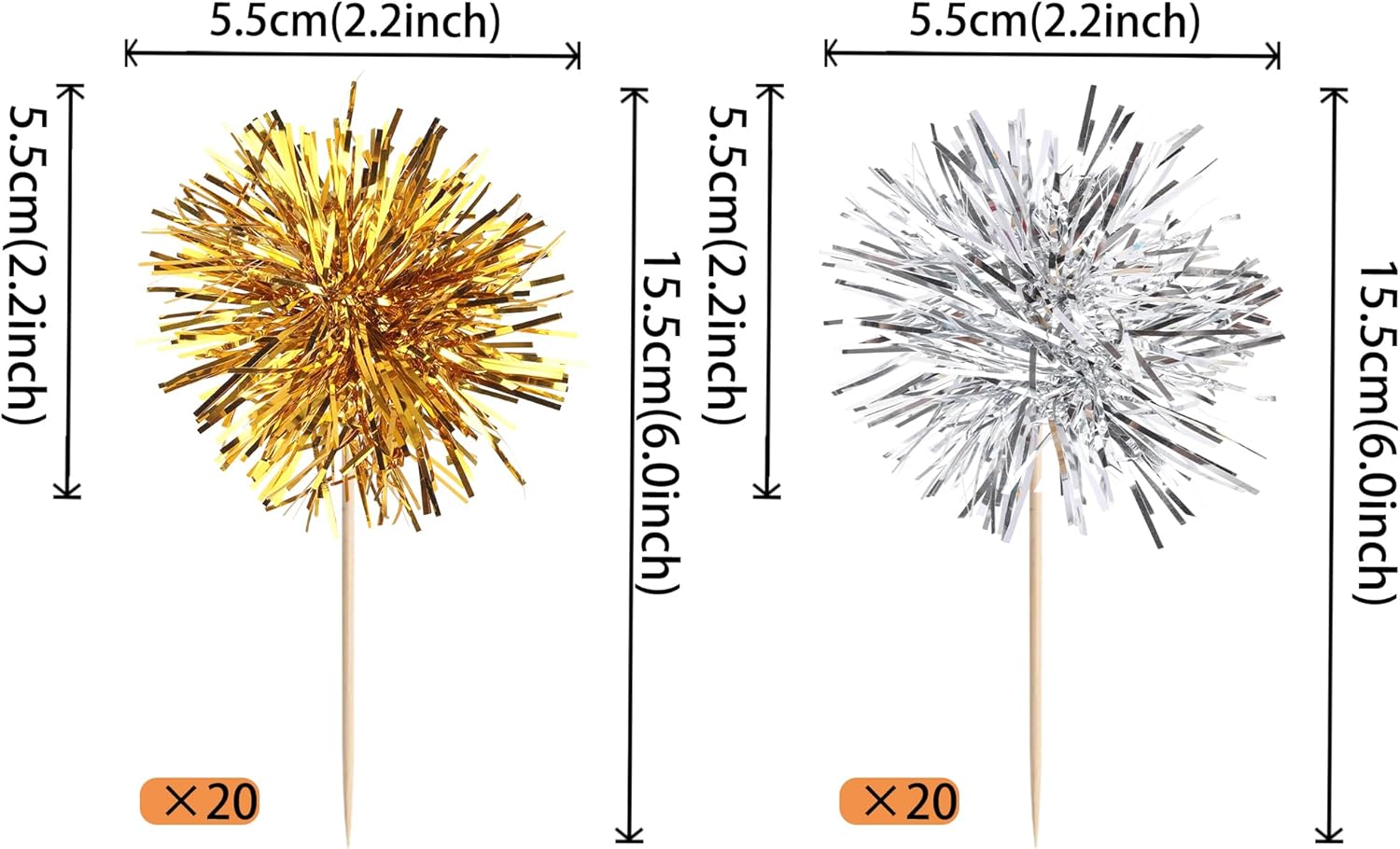 40 PCS Foil Firework Cupcake Toppers Sparkle Tinsel Cupcakae Picks Foil Firework Party Decorations Cocktail Fruit Toothpick for Fireworks Theme Birthday Wedding Graduation Party Decoration Gold Silver