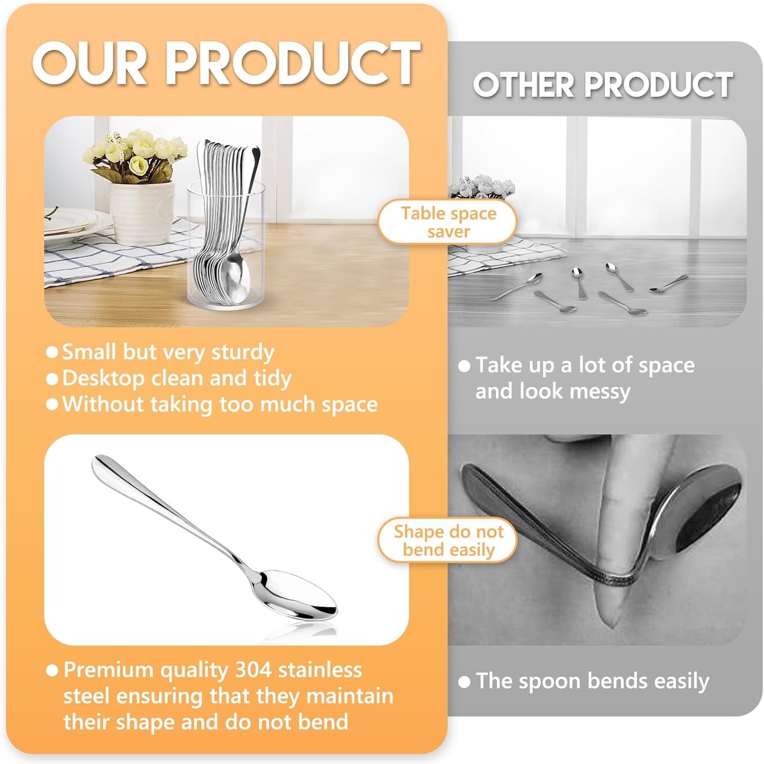 - 3.Table space saver: 3.54inch height size demitasse espresso spoons is small but very sturdy, makes your desktop clean and tidy without taking too much space! Besides, acrylic cylinder holder is not fragile, so you don't have to worry about breaking the holder.
