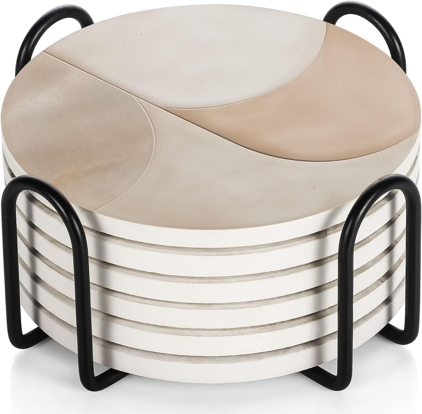 - INSIDE EVERY VEYRO SET: Each set includes 6 ceramic coasters (4" diameter, 0.28" thick) with a matte printed finish and soft cork backing that prevents slipping while creating a subtle floating effect, plus a sturdy black metal holder in smooth matte finish, all packed in a gift-ready box. The size was chosen with intention — wide enough for tumblers, mugs, wine glasses, or cocktails, yet balanced for smaller cups, candles, or planters. Each coaster carries a satisfying weight that feels premium in hand, combining elegance with everyday function to create a versatile piece that protects and decorates beautifully.