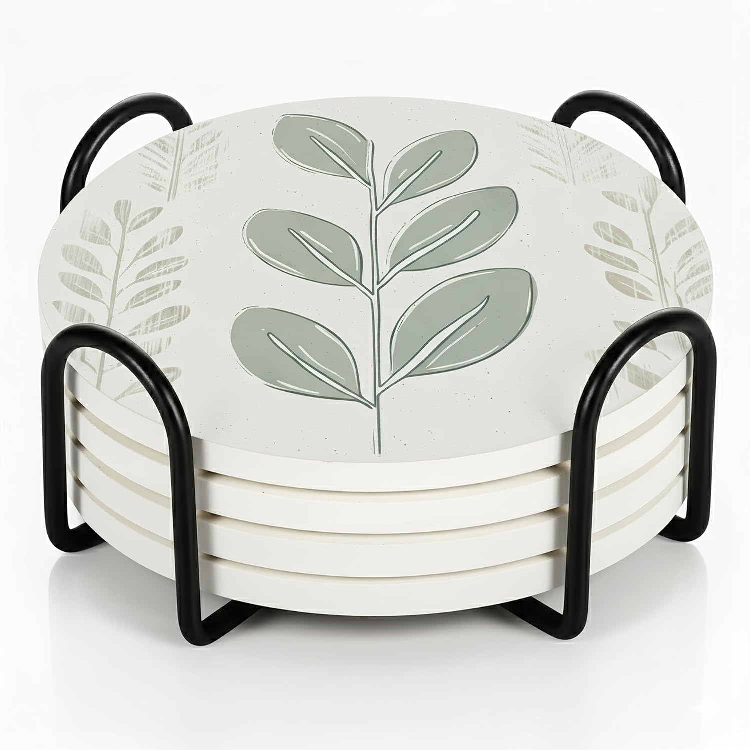 - INSIDE EVERY VEYRO SET: Each set includes 4 ceramic coasters (4" diameter, 0.28" thick) with a matte printed finish and soft cork backing that prevents slipping while creating a subtle floating effect, plus a sturdy black metal holder in smooth matte finish, all packed in a gift-ready box. The size was chosen with intention — wide enough for tumblers, mugs, wine glasses, or cocktails, yet balanced for smaller cups, candles, or planters. Each coaster carries a satisfying weight that feels premium in hand, combining elegance with everyday function to create a versatile piece that protects and decorates beautifully.