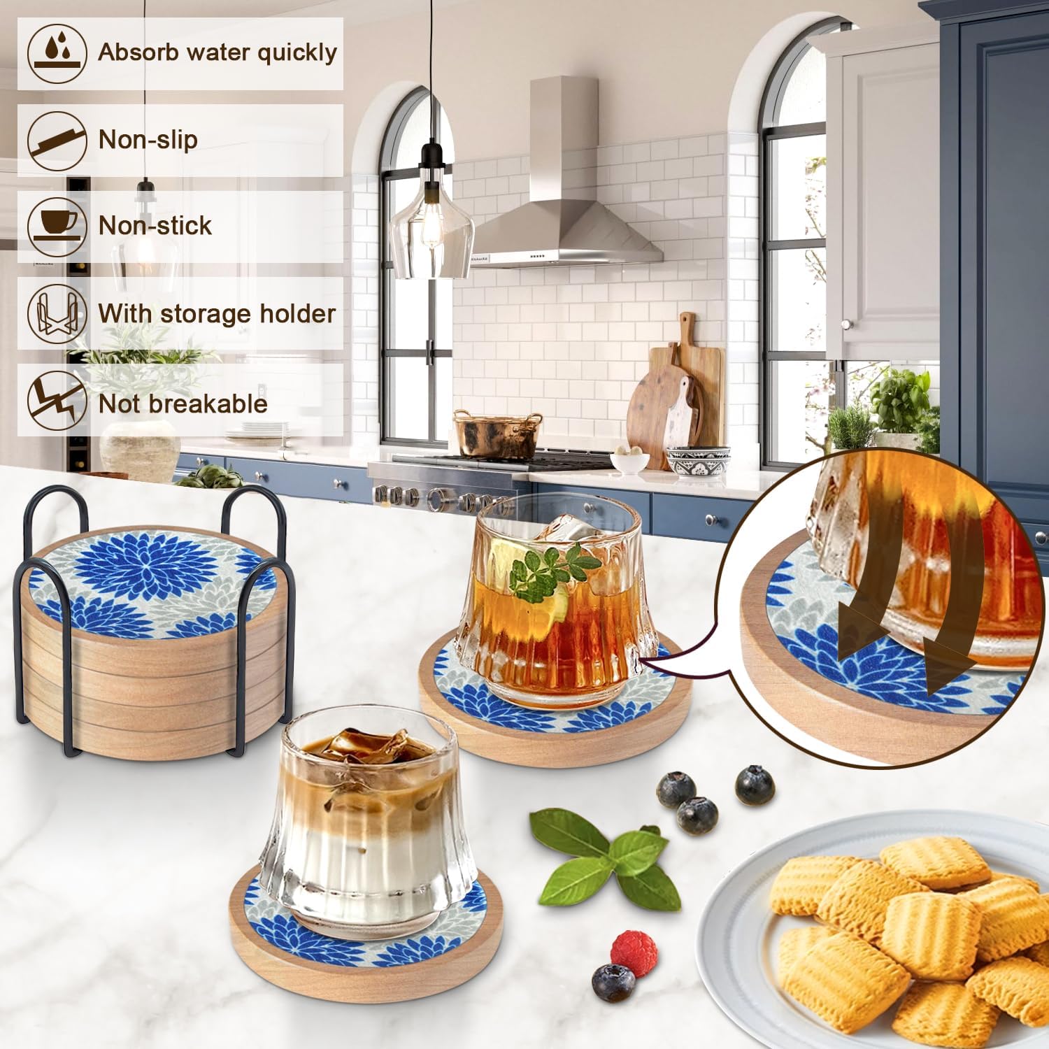 Wood Coasters Set of 6 with Holder, Cewiru Cup Mat for Drinks, Absorbent Coasters with Felt Insert for Coffee Table Protection, Modern Style Home Dining Table Decor, 4.3" Blue