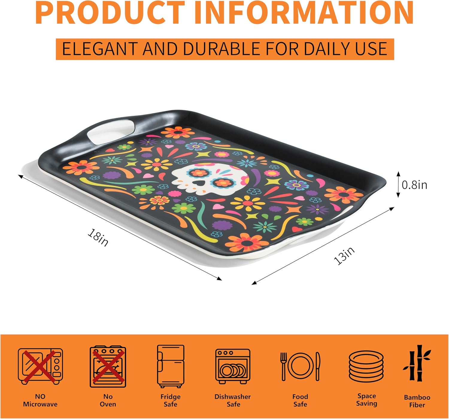 - Day of the Dead-Themed Bamboo Fiber Large Serving Trays feature Sugar Skull and Marigold Design