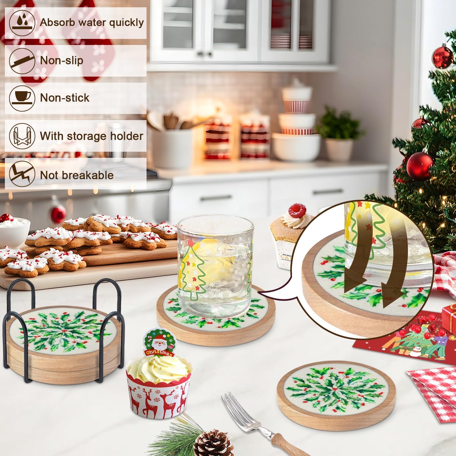 - Non-stick & Coaster with Holder: Cup coaster is thick and flat, good moisture absorption can effectively isolate adhesion forces, prevents coaster from sticking to glasses; durable & aesthetical, non-breakable, suitable for hot and cold drinks, effortlessly protects your furniture, tabletops & counter top, brings your pleasant drinking experience.