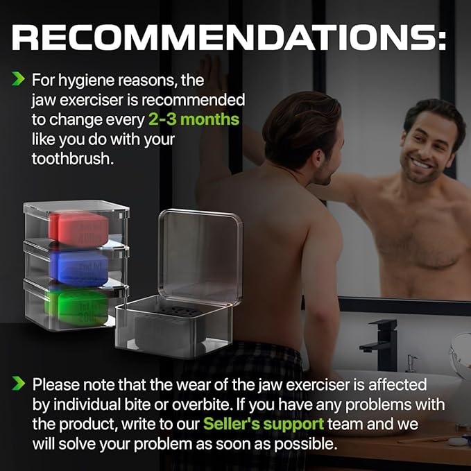 - Effective Jawline Sculpting: Our jaw workout set is specifically designed to target and tone the muscles around your face, helping you achieve a more defined and confident appearance. With just a few minutes of jaw gum each day, you can strengthen and tighten your smile, saving you valuable time while achieving noticeable results. Ejercitador de mandibula.