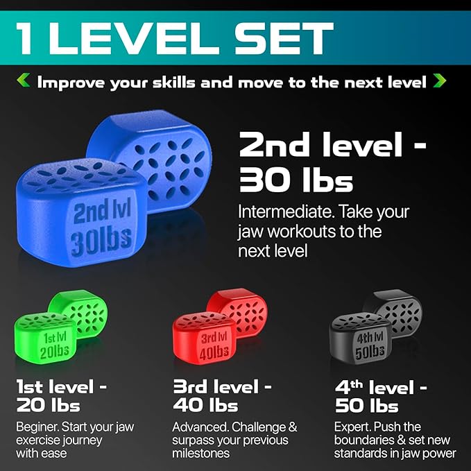 - 1-Pack Set: Includes 2 pcs & 1 resistance level (Blue: 30 lbs). Allowing you to customize your workout and gradually increase the intensity as your jaw muscles grow stronger. Exercise & progress at your own pace! Jaw strengthener
