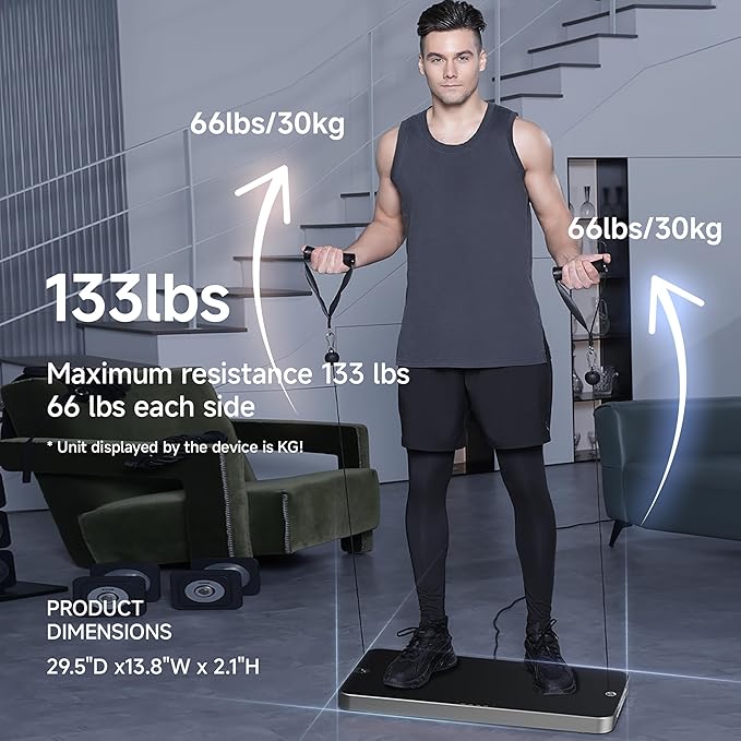 - 【A 2.8 ft² Digital Home Gym with An Ultra-Thin Design】the P1 Lite has a thickness of only 2.1 inches and weighs just 26 pounds, making it easy to lift. Engages most muscle groups effectively. Offering functionality beyond traditional gym equipment. With max resistance up to 133 lbs and 4 training modes, it suits from beginners to advanceds.Please note that the resistance measurement unit for this equipment during use is kilograms.