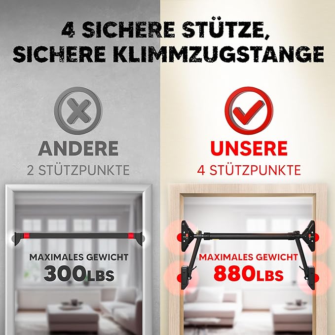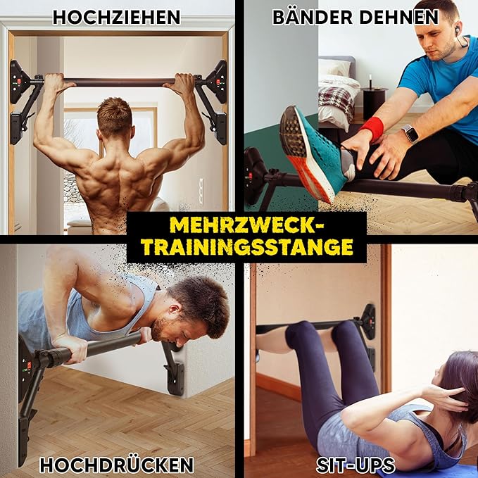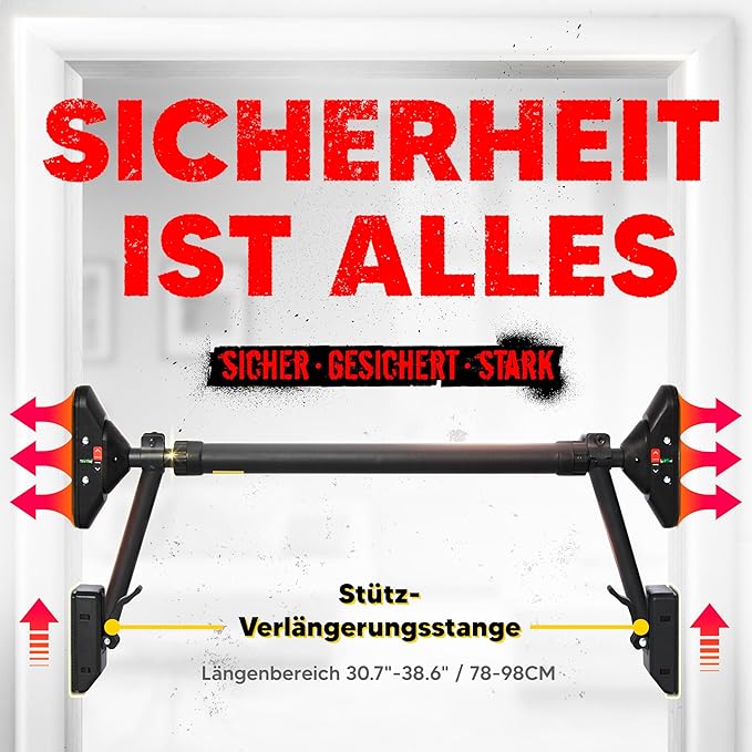 - 4 secure support points – unlike other pull-up bars that only have 2 support points and can easily fall off, our bar has 4 support points with a secure and firm locking mechanism. The sturdy three-level gear lock ensures that the bar stays in place no matter how intense your workout is.
