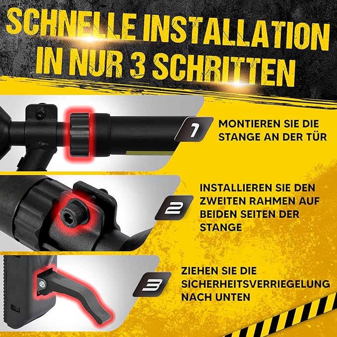 - Quick installation – in just 3 easy steps, you can mount the bar on your door, install the second frame on both sides of the bar, and pull down the safety lock. No fuss, no hassle, and you're ready to work out in no time!
