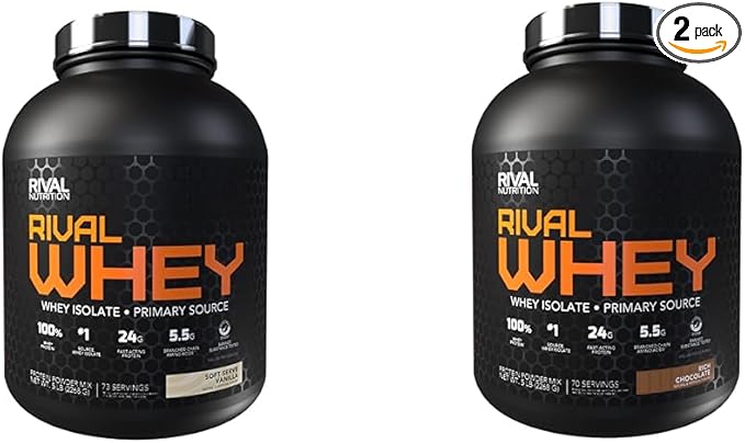 - Contains 5 lbs each of Rivalus Whey Vanilla and Rich Chocolate flavors for a total of 10 lbs of 100% whey protein