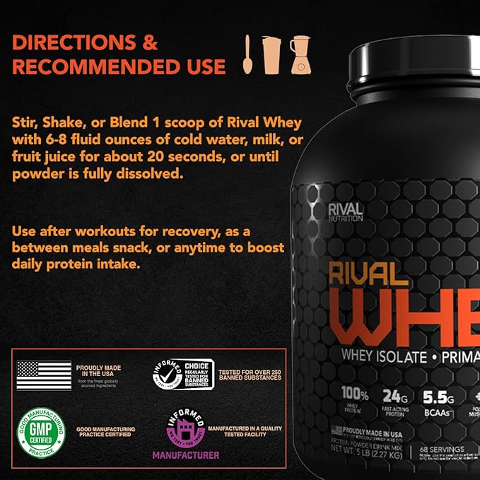- Easy to Use: Stir, Shake, or Blend 1 scoop of Rival Whey with 6-8 oz. of cold water, milk, or fruit juice until powder is dissolved. Tip: For added variety, try blending Rival Whey with a fresh bowl of fruit, mixing into yogurt, or a bowl of cereal for added variety.