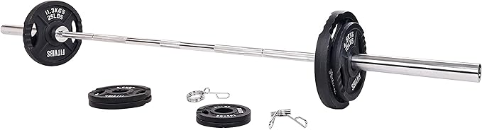 - 130 pounds set: 1x 7 feet Olympic Barbell (45 lbs), 2x 2.5lb, 2x 5lb, 2x 10lb, 2x 25lb cast iron plates