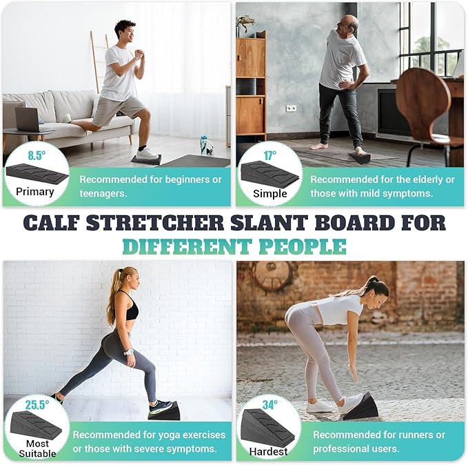 - [SIMPLE & EFFECTIVE SLANT BOARD] Our calf stretcher squat wedge weighs only 1 pound and can support a 480lbs adult standing, so it will never deforms. The calf stretcher has five adjustable angles: 8.5°, 17°, 25.5°, 34°, 180°. You can choose different levels of calf stretches from easy to hard. Foot calf stretcher can also add variety and challenge to your exercise program. As your physical therapy equipment, it fits in your home as well as in your office.