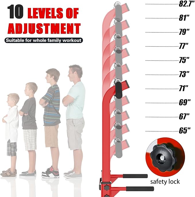 - 10 Levels Height Adjustment: Measuring 32.3Lx29.5Wx65~82.7H (inches) and supporting a weight capacity of 330LBS, this pull up bar is an ideal fitness tool for adults in their homes or offices. The height of the pull up tower can be adjusted from 58.5~82.7", making it suitable for all fitness needs. And the lowest level is tailored for kids, while the pull up bar station caters to the entire family's workout needs.