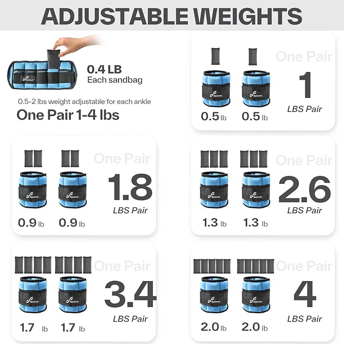 - ADJUSTABLE WEIGHTS: The Sportneer ankle weights come in pairs; each single weight comes with 5 removable sandbags, which weigh 0.4 LB. Each single weight can be adjusted from 0.5 lbs to 2 lbs, and one pair can be adjusted from 1 lbs to 4 lbs by adding or removing the sandbags.
