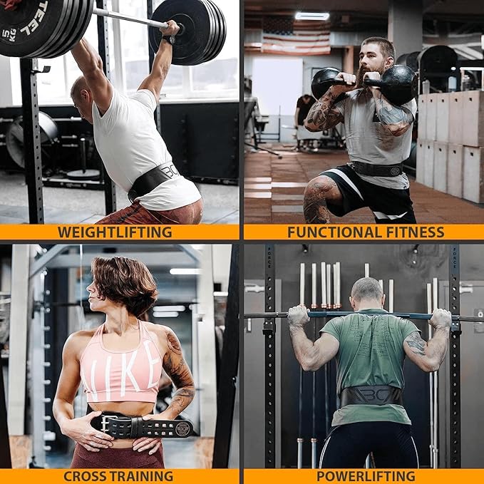 - PREMIUM 4 INCH GENUINE LEATHER WITH THE DOUBLE ROLLER STAINLESS STEEL BUCKLE - Our Functional Workout Belt is treated with two layers of leather for greater protection and durability. 4 Strengthened Bolts prevent slipping and riding of the leather weight lifting belt. The buckle doesn’t have contact with your skin preventing any discomfort