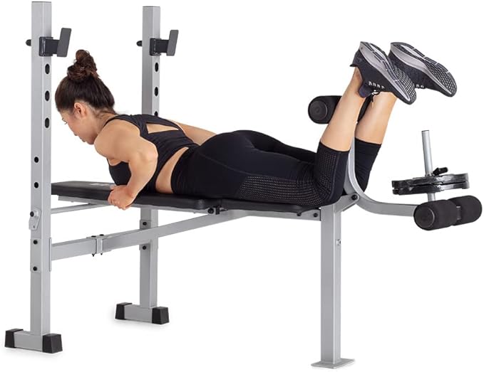 - Standard Sizing; This weight bench is compatible with 6.5-foot standard barbells and 1” standard weight plates (sold separately); Exercise Chart Included; Learn new routines and proper lifting form