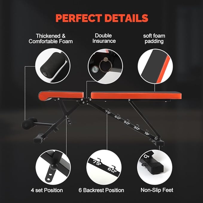 - Versatile Adjustable Workout Bench: The full body exercise bench could be incline decline from flat to 75°backrest, 6 back position, 4 seat postion, 3 foot postion choice for adjust, to meet different stage exercise need.