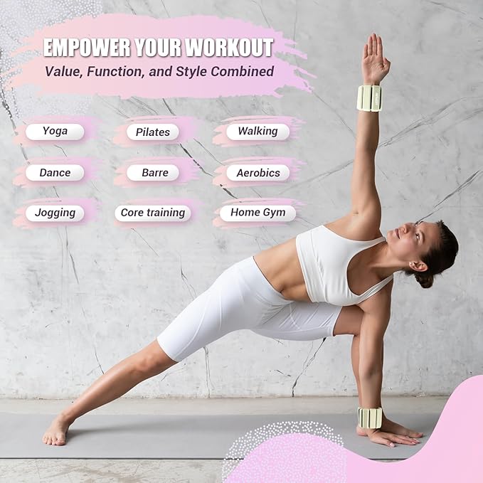 - [PERFECT FOR EVERYDAY FITNESS] Our wearable adjustable wrist and ankle weights set of 2 with a total weight of 2LBS are perfect for women, men and beginners. It adds weight to your arms, wrists and ankles, and you can wear the weight bracelet for Pilates, yoga, swimming, aerobics, running and walking and more. These Pilates weights create constant resistance to help you burn more calories and improve your indoor or outdoor training.